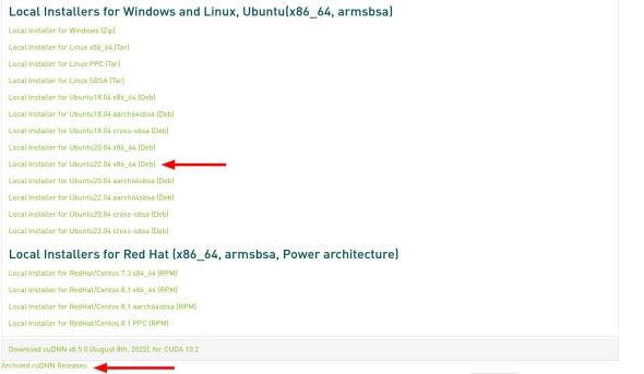 Laden Sie die Datei für Ubuntu 22.04 oder Ihre verwendete Ubuntu-Version und Ihre Architektur herunter. Archivierte Ausgaben und weitere Architekturen finden Sie hinter dem Link Archived cuDNN Releases.
