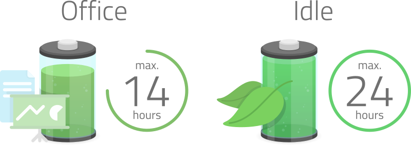 Under the stylish looking hood, the fast but power efficient Intel Core i5-1135G7 provides processing power for all everyday tasks, while the large 73 Wh lithium-ion battery in combination with the innovative Low-Power display ensures spectacular runtimes of even up to 24 hours.